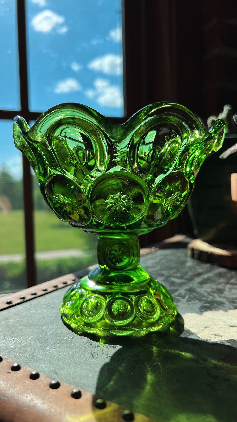Vintage L.E. Smith Moon and Stars | Green Glass | Candy Dish | Pedestal Bowl